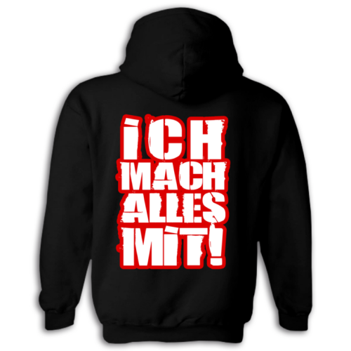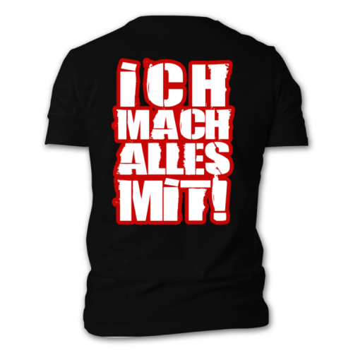 Auf der Vorderseite das Band-Logo mit Schriftzug und „Musik für die Unterschicht“. Auf der Rückseite dann der Kult-, Sex-, Sauf-, Sport- und Randale- Spruch „Ich mach alles mit“